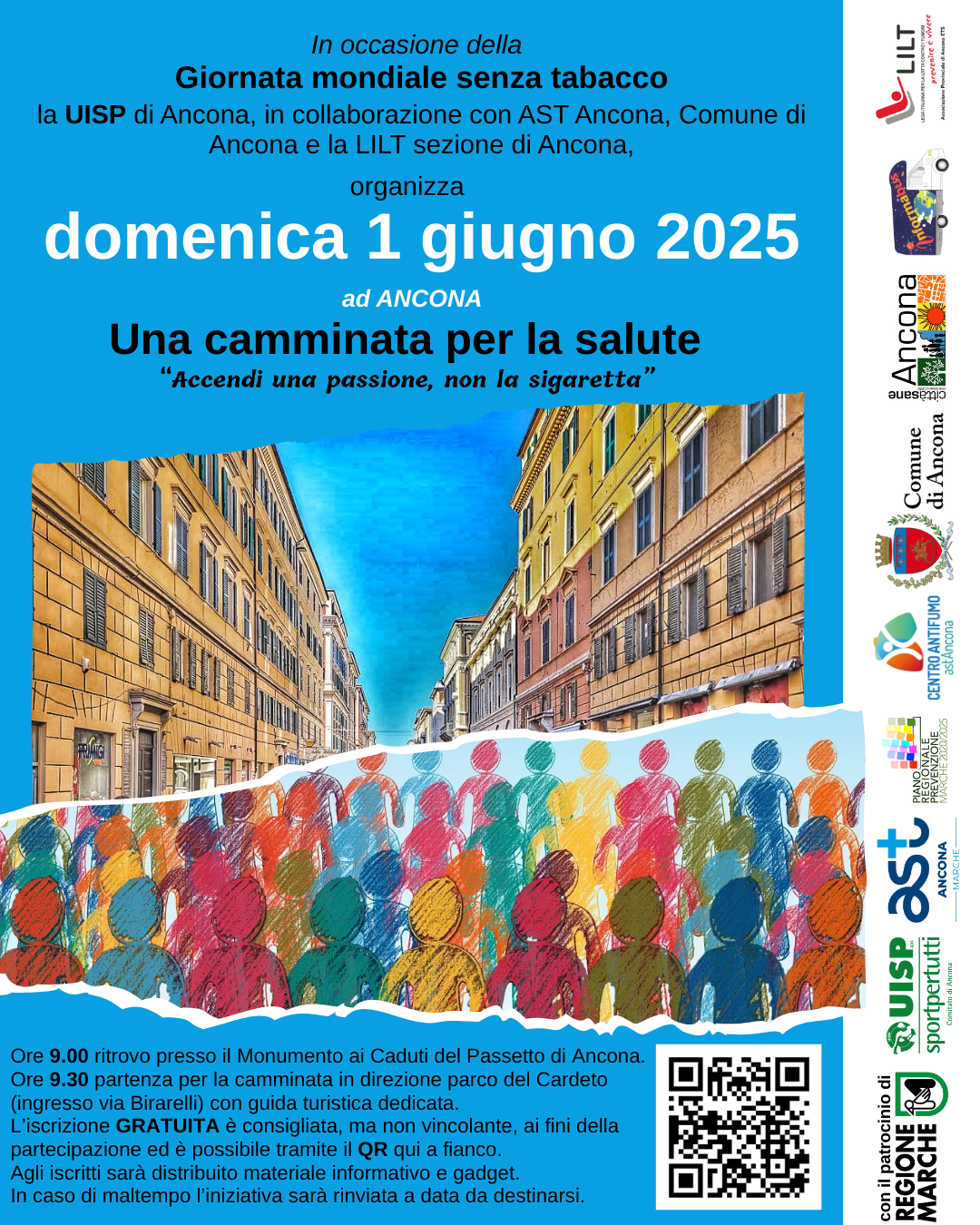 In occasione degli eventi legati alla Giornata Mondiale Senza Tabacco, promossa dall’Organizzazione Mondiale della Sanità, la UISP Comitato di Ancona organizza - in collaborazione con la AST Ancona, il Comune di Ancona Ufficio Promozione della Salute e Rete Città Sane Ancona e la LILT sezione di Ancona – questa iniziativa di promozione dell’attività motoria e dei sani stili di vita, per prevenire e contrastare il tabagismo.