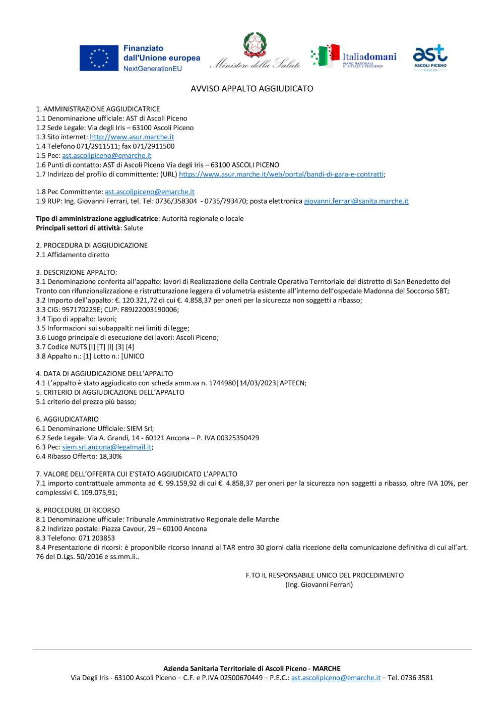 - AVVISO APPALTO AGGIUDICATO LAVORI REALIZZAZIONE COT SI SAN BENEDETTO DEL TRONTO