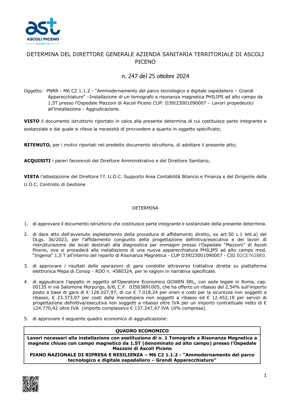 - 2024 Aggiudicazione appalto integrato progettazione e lavori per sostituzione RM Ospedale Mazzoni PNRR
