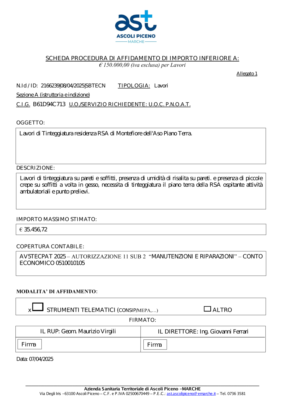2025 SCHEDA affidamento lavori di Tinteggiatura residenza RSA di Montefiore dell'Aso Piano Terra