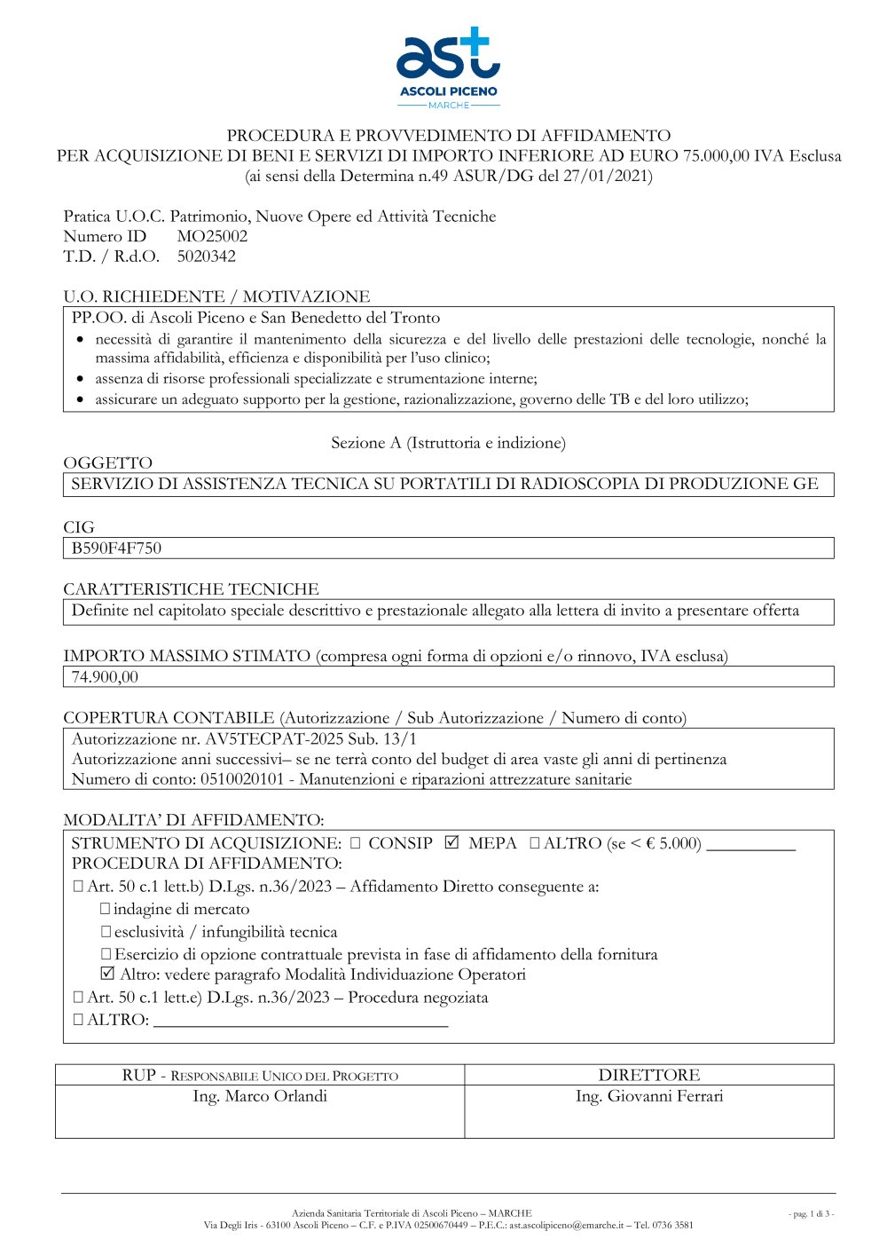 - 2025 SCHEDA AFFIDAMENTO SERVIZIO DI ASSISTENZA TECNICA SU PORTATILI DI RADIOSCOPIA DI PRODUZIONE GE