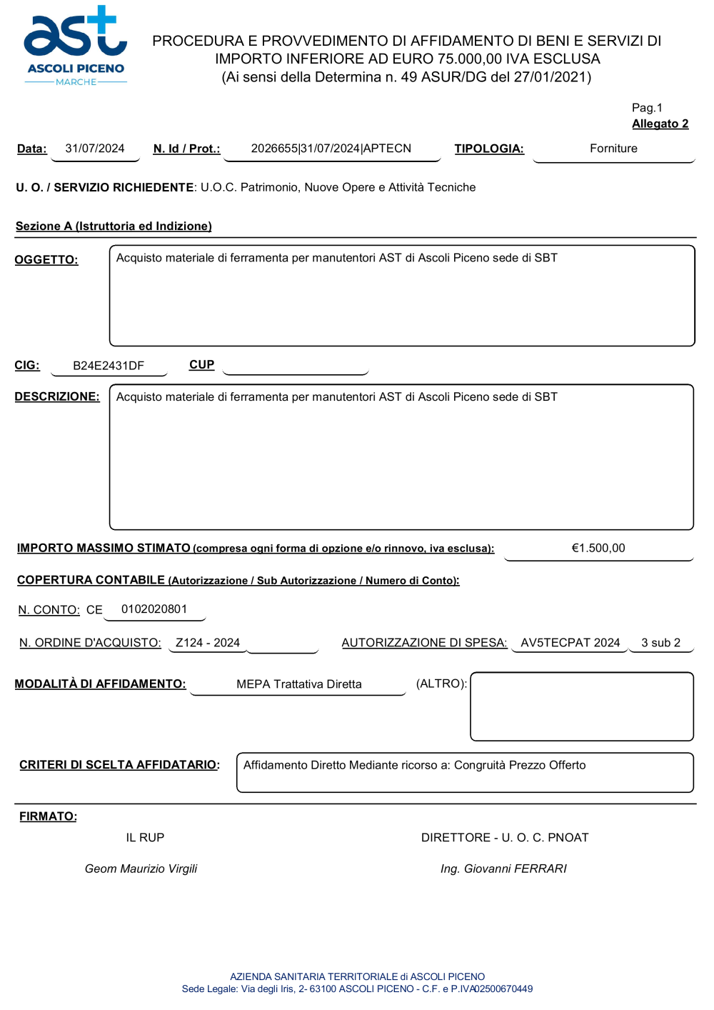 - Acquisto materiale di ferramenta per manutentori AST di Ascoli Piceno sede di San Benedetto del Tronto