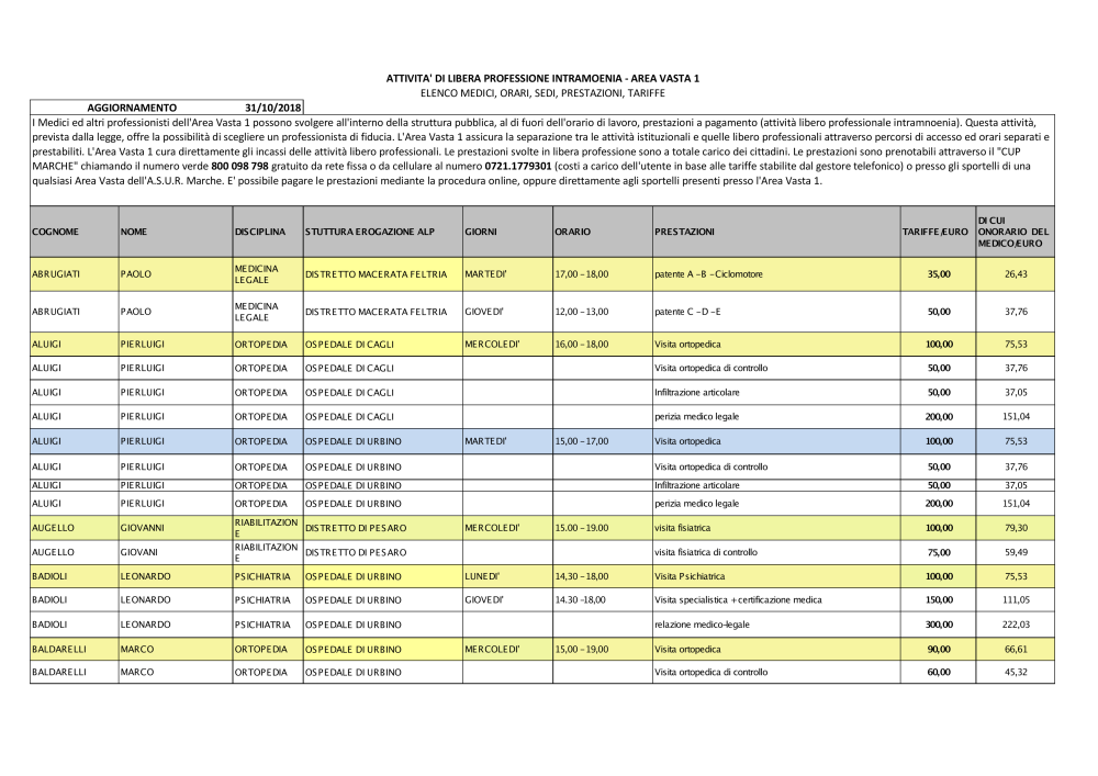 ELENCO MEDICI, ORARI, SEDI, PRESTAZIONI, TARIFFE PER LA LIBERA PROFESSIONE INTRAMOENIA DELL'AREA VASTA 1 - ANNO 2018