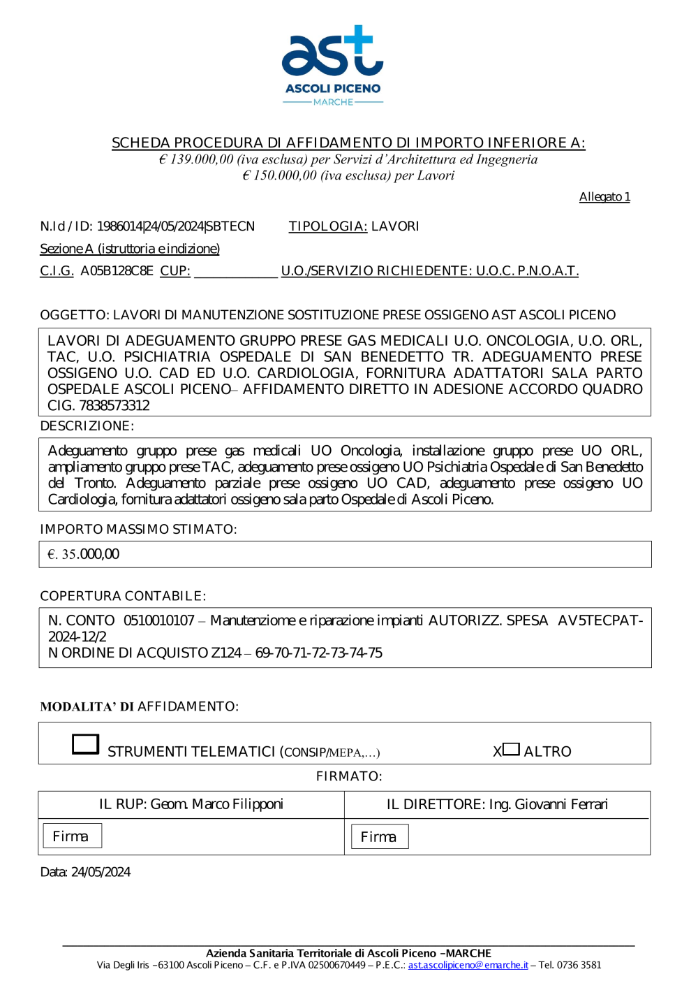 SCHEDA AFFIDAMENTO LAVORI SOSTITUZIONE PRESE GAS MEDICALI AST DI ASCOLI PICENO