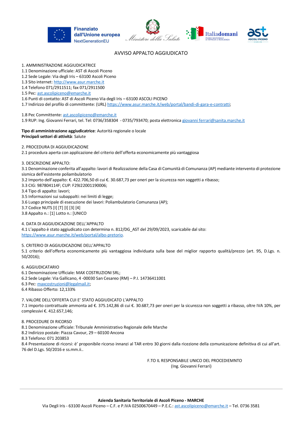 - Avviso APPALTO AGGIUDICATO Lavori realizzazione Casa di Comunità di Comunanza -PNRR