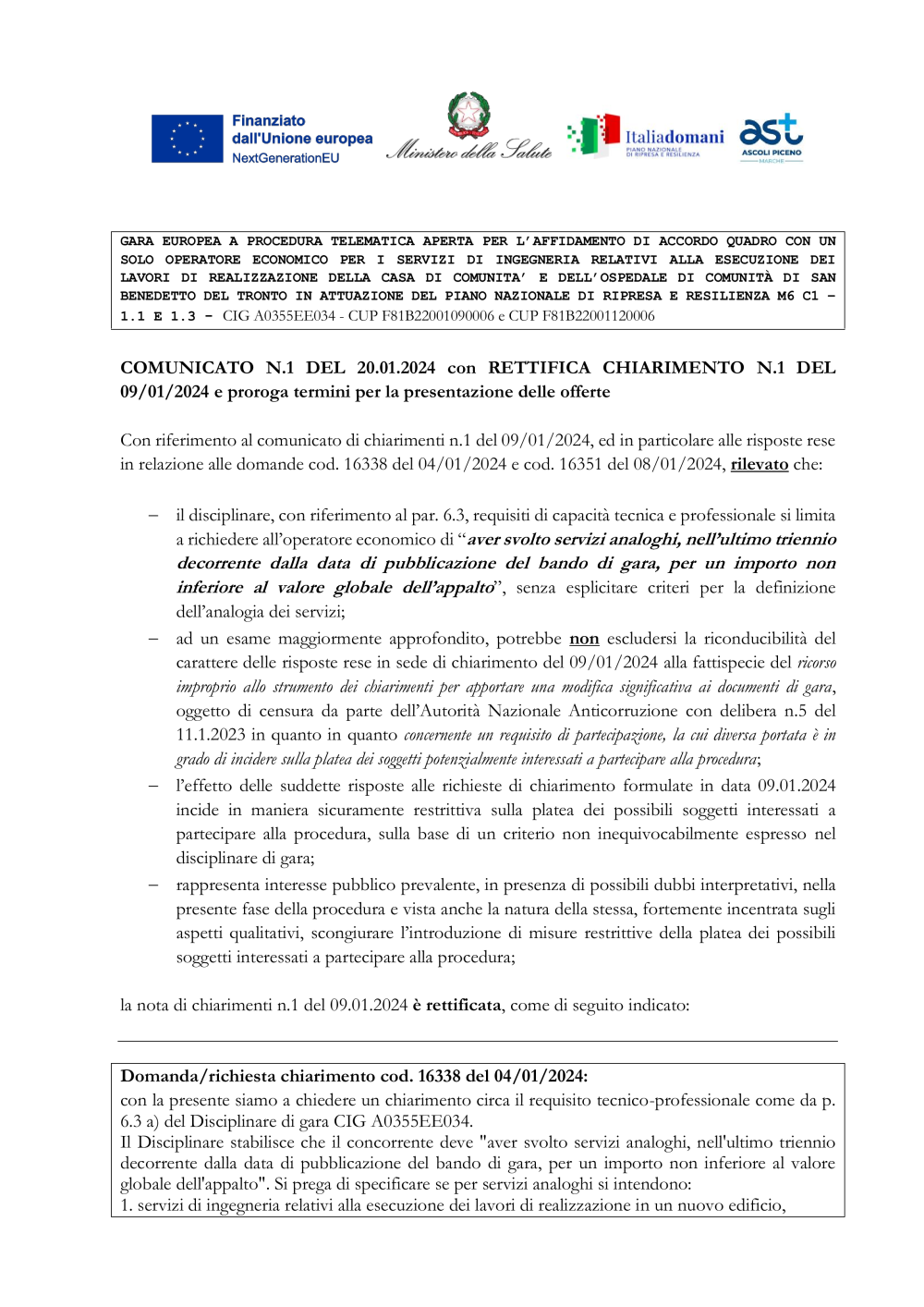 - Comunicato n.1 del 20 gennaio 2024 e rettifica chiarimento procedura telematica per accordo quadro affidamento servizi ingegneria esecuzione lavori casa di comunità ed ospedale di comunità San Benedetto del Tronto con fondi PNRR