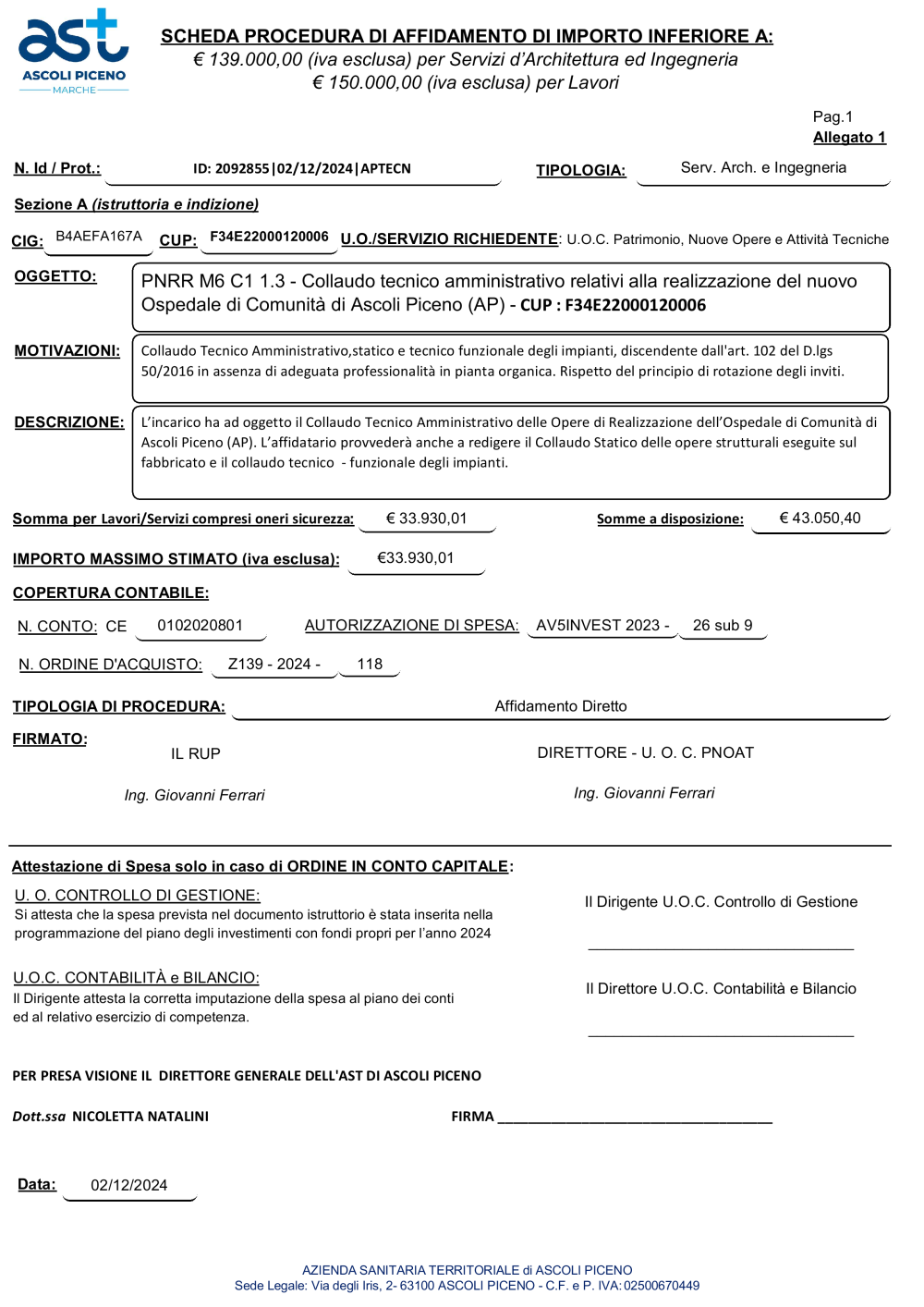 - 6.12.2024 SCHEDA AFFIDAMENTO COLLAUDO Collaudo Tecnico Amministrativo,statico e tecnico funzionale ex art. 102 D.lgs 50.2016 in assenza di adeguata professionalità in pianta organica