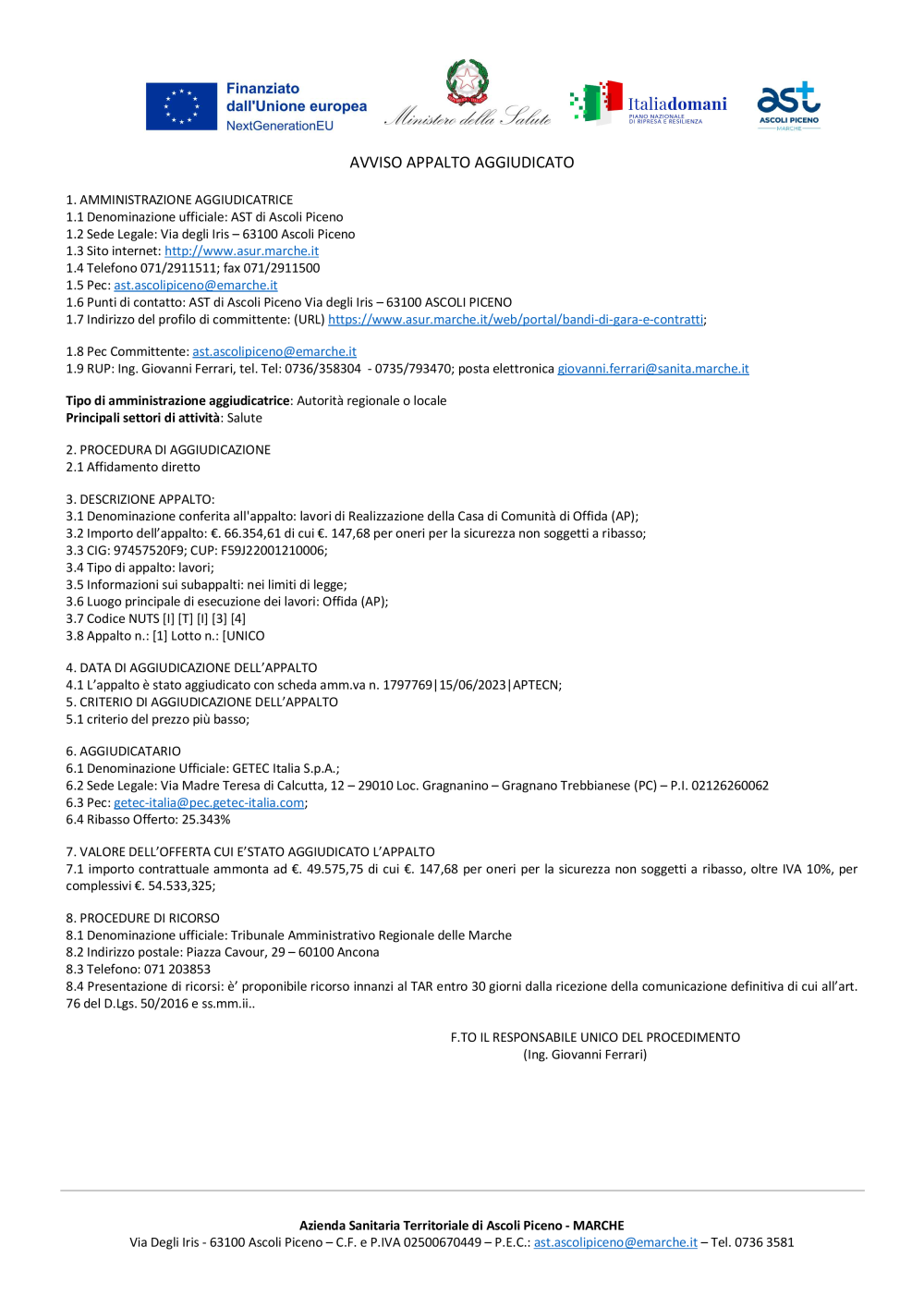 - Avviso appalto aggiudicato per lavori realizzazione Casa di Comunità di Offida