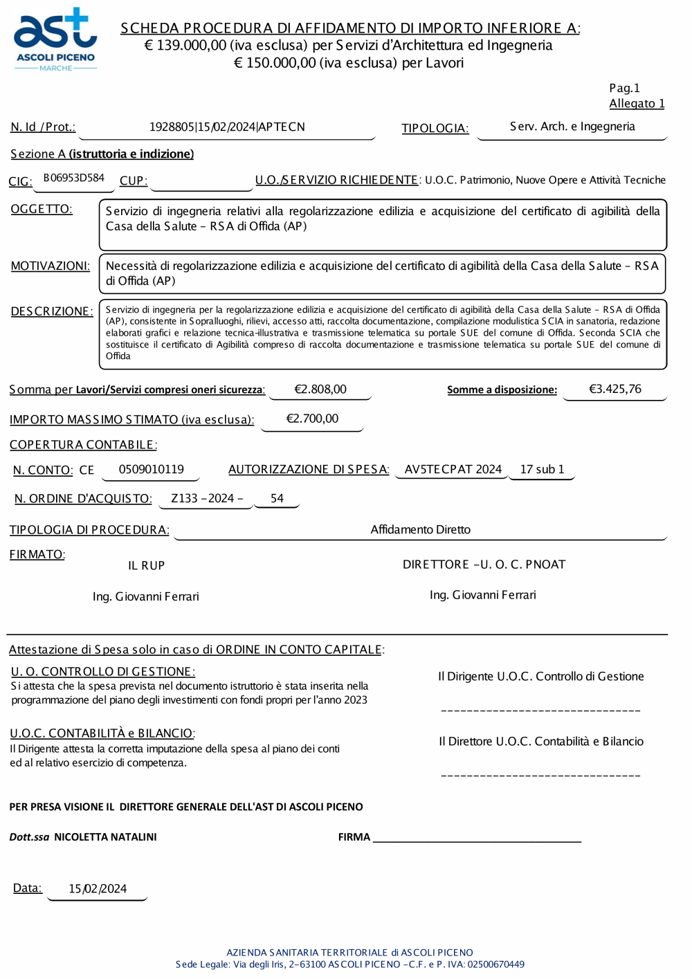 2024 SCHEDA Affidamento Servizio Ingegneria relativi alla regolarizzazione edilizia e acquisizione certificato agibilità Casa della Salute RSA Offida
