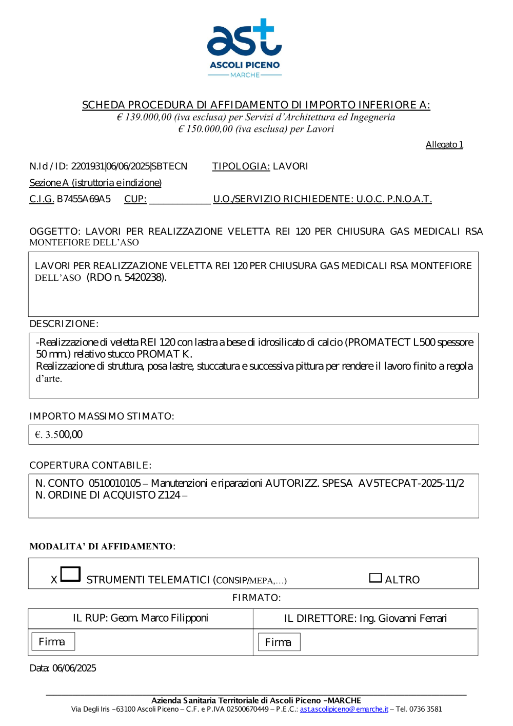 2025 SCHEDA AFFIDAMENTO LAVORI PER REALIZZAZIONE VELETTA REI 120 PER CHIUSURA GAS MEDICALI RSA MONTEFIORE DELL’ASO