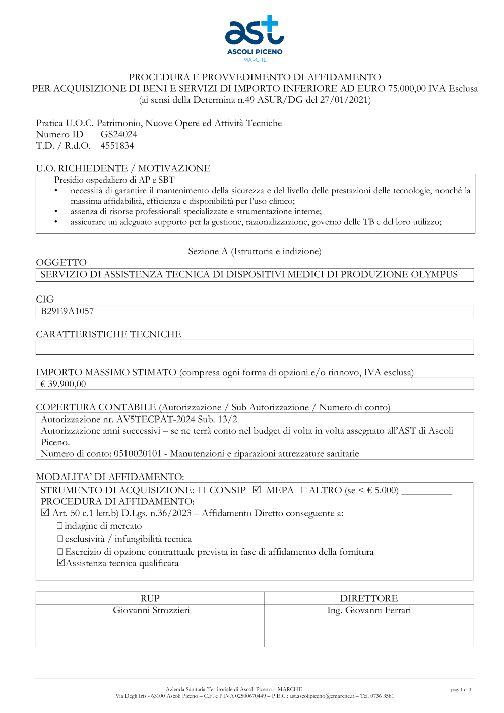 SCHEDA AFFIDAMENTO SERVIZIO DI ASSISTENZA TECNICA DI DISPOSITIVI MEDICI DI PRODUZIONE OLYMPUS