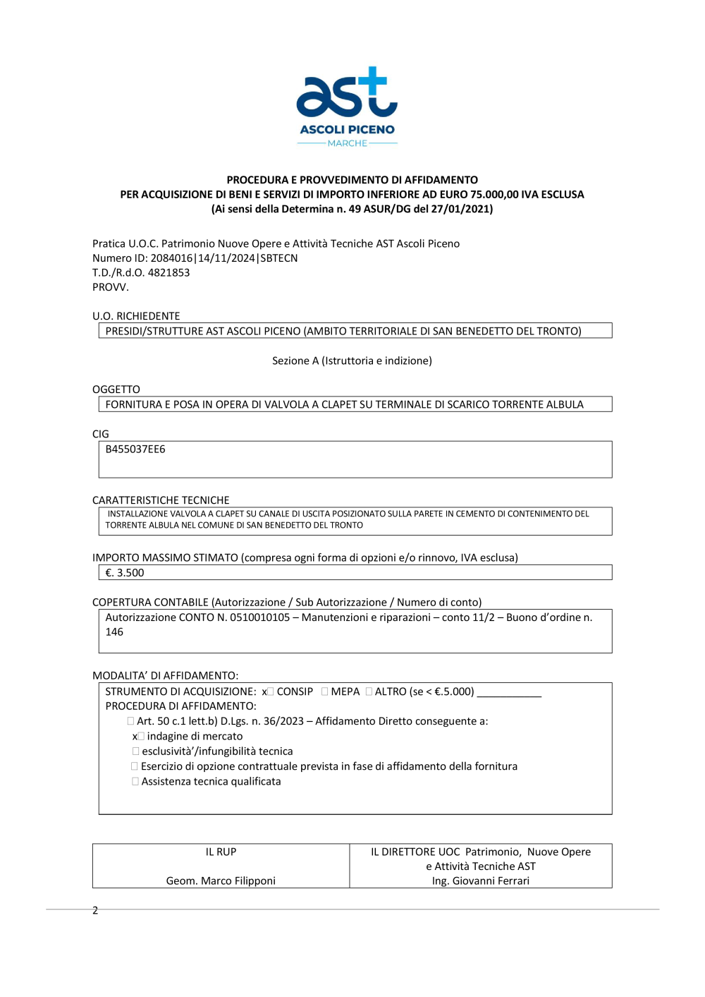 - 2024 SCHEDA FORNITURA E POSA IN OPERA DI VALVOLA A CLAPET SU TERMINALE DI SCARICO TORRENTE ALBULA