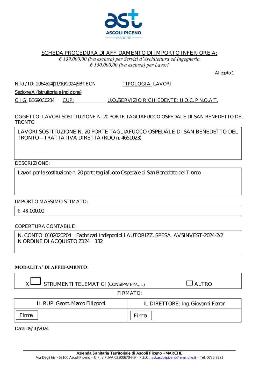 - 2024 SCHEDA AFFIDAMENTO LAVORI SOSTITUZIONE N. 20 PORTE TAGLIAFUOCO OSPEDALE DI SAN BENEDETTO DEL TRONTO – TRATTATIVA DIRETTA (RDO n. 4651023)